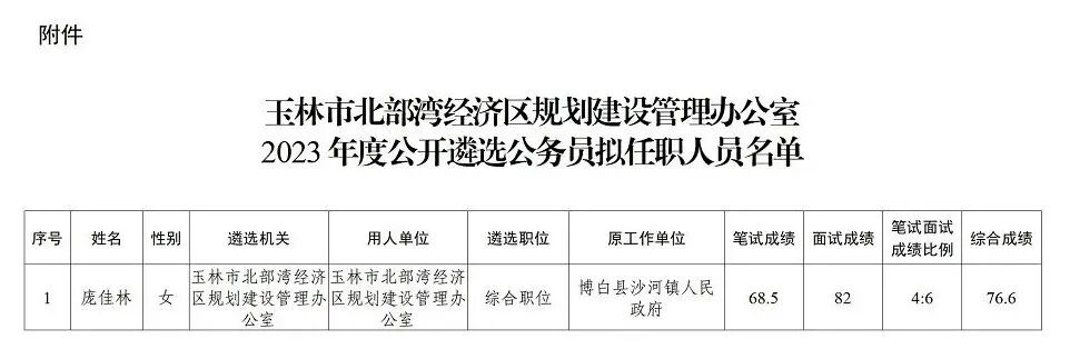根据《玉林市2023年度公开遴选公务员公告》要求,经过公开报名、资格审查、笔试、面试、考察、体检等程序,确定庞佳林同志(详见附件)为玉林市北部湾经济区规划建设管理办公室2023年度公开遴选公务员拟任职人员,现予以公示,公示期为2023年9月4日至9月8日(5个工作日)。