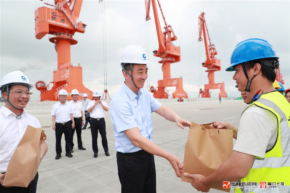 在玉林海港码头,王琛看望慰问一线作业人员,向他们致以美好祝福。